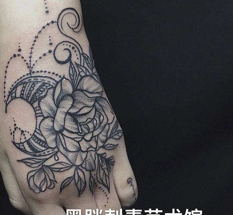 • 手背潮流时尚的玫瑰花眼睛纹身图案