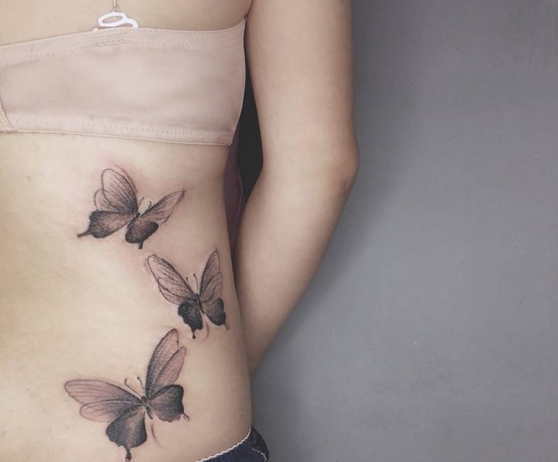 蝴蝶纹身图片_腰部老传统水墨纹身图案