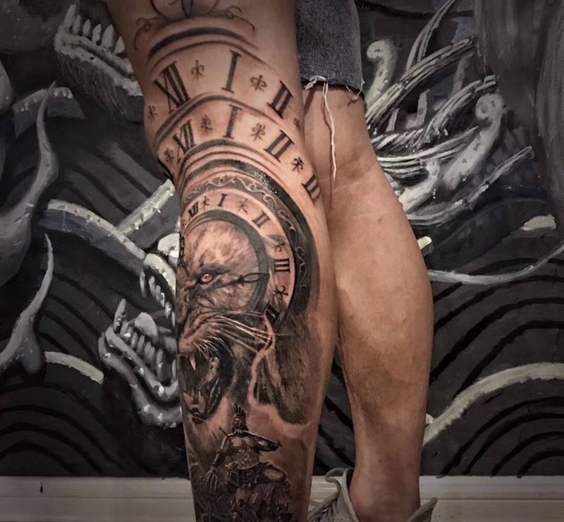• T网红王老大花腿龙纹身图片_腿部新传统纹身图案
