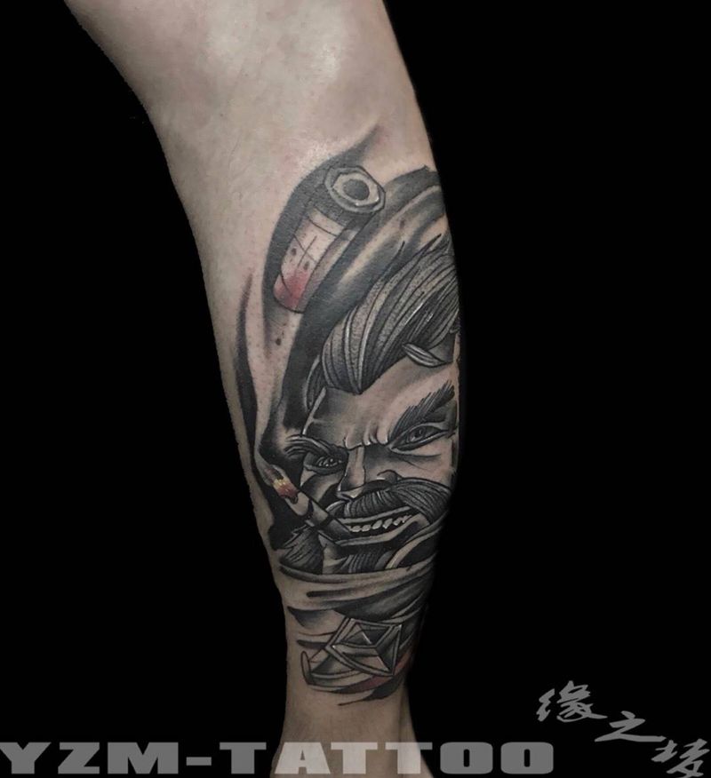 【英雄联盟:法外狂徒】纹身图片_成品肖像欧美几何人物腿部纹身图案