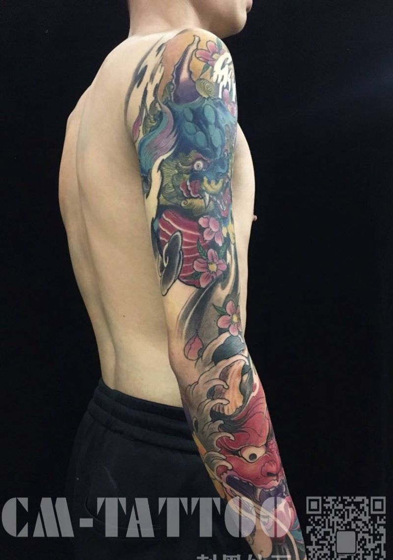 当前位置: 首页 >湖北省省直辖纹身店-刺墨纹身纹身图案>唐狮配般若纹身图片