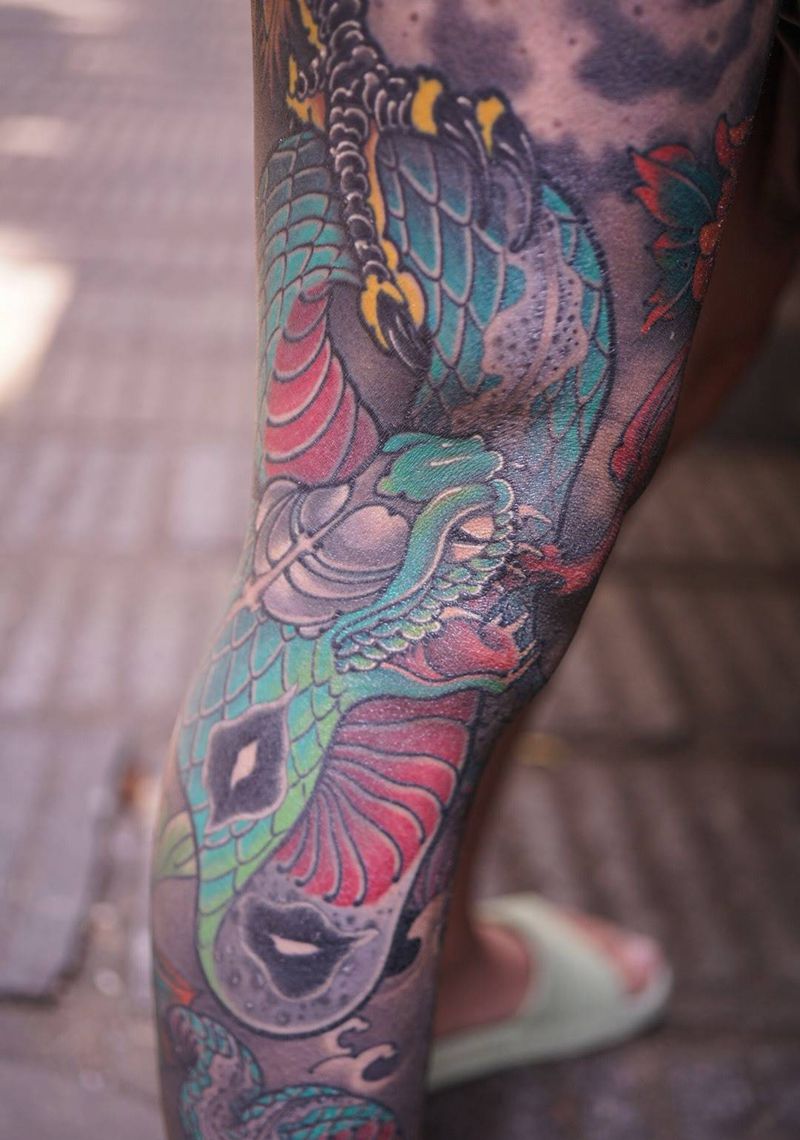 • T网红王老大花腿龙纹身图片_腿部新传统纹身图案