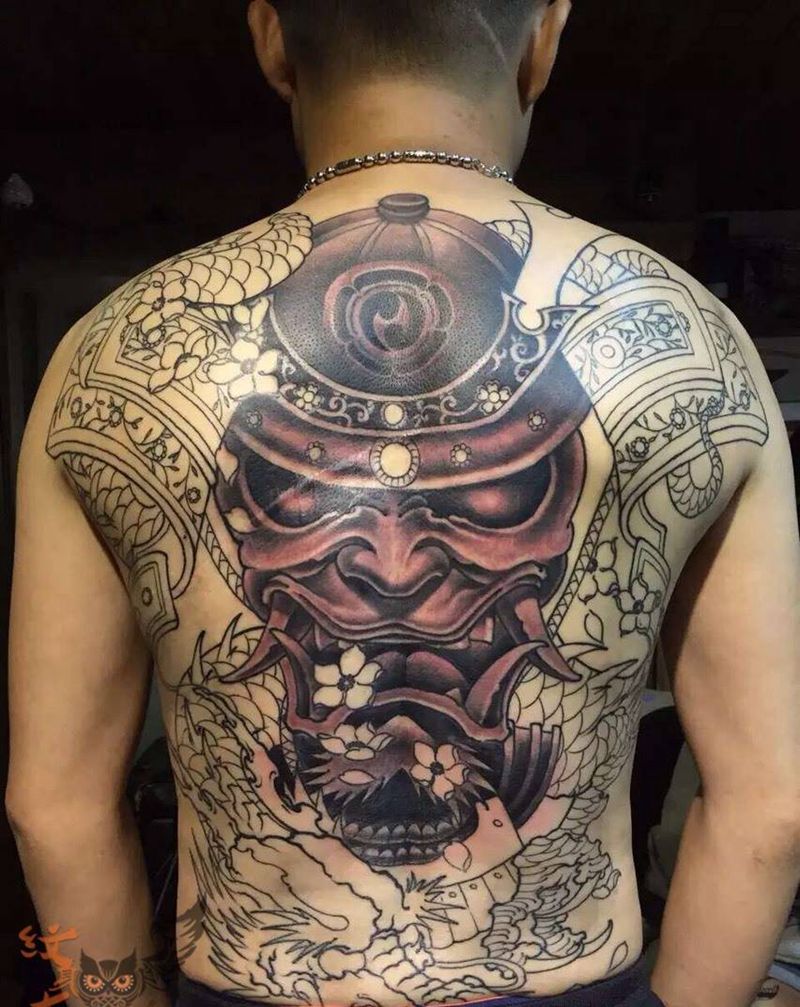武士头盔满背纹身图片_传统写实背部纹身图案
