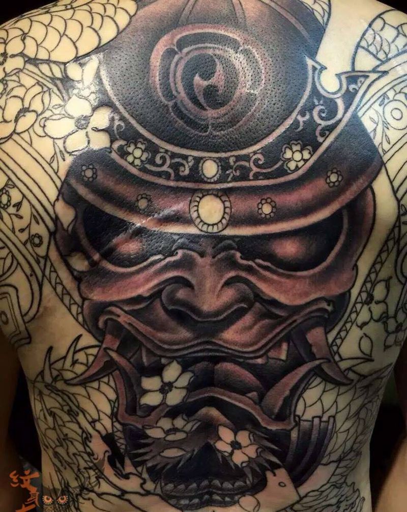 武士头盔满背纹身图片_传统写实背部纹身图案