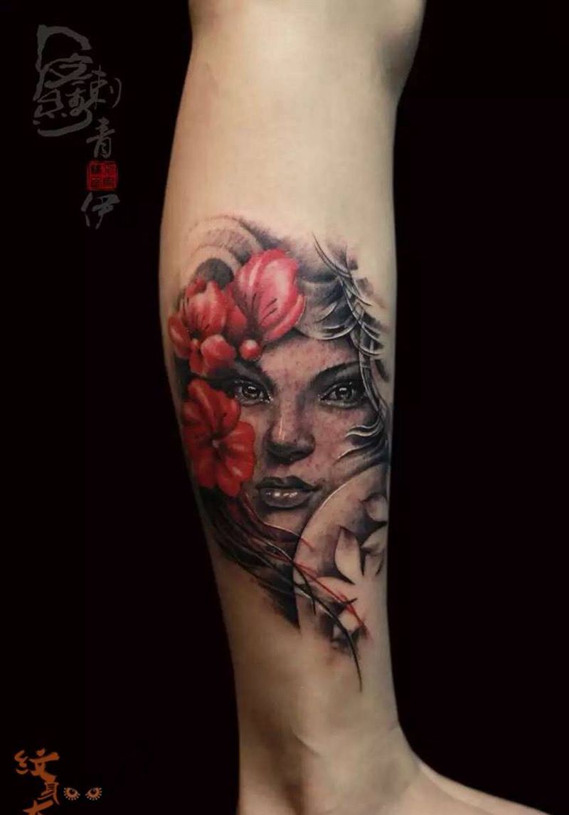 肖像纹身图片_肖像原创情侣人物写实腿部脚部纹身图案