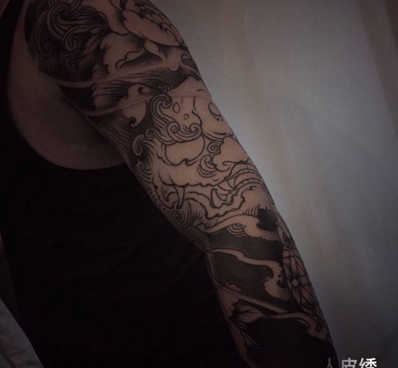 当前位置: 首页 >湖南省长沙市纹身店-人皮绣刺青工作室纹身图案>唐狮牡丹花臂纹身图片_手臂传统宗教原创手稿纹身图案