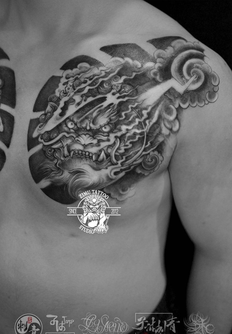 水'火 麒麟 胸前 恢复纹身图片_老传统新传统纹身图案
