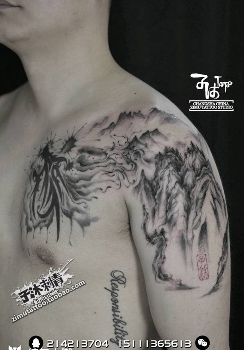当前位置: 首页 >湖南省长沙市纹身店-子沐刺青艺术纹身工作室纹身图案>耗时4.2 大臂山水纹身图片_国画泼墨成品纹身图案
