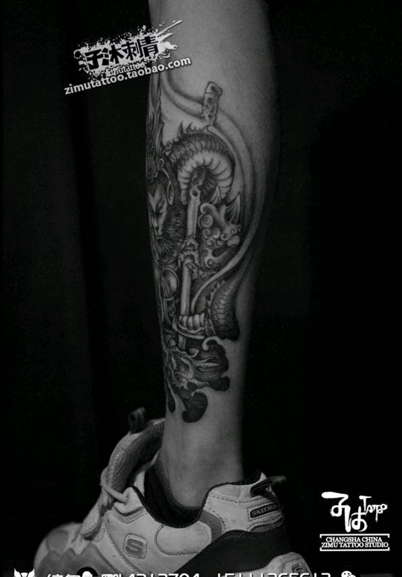 • T网红王老大花腿龙纹身图片_腿部新传统纹身图案