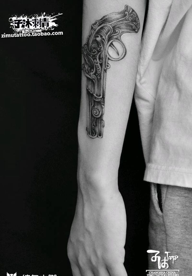 当前位置: 首页 >湖南省长沙市纹身店-子沐刺青艺术纹身工作室纹身图案>小臂 复古手枪纹身图片