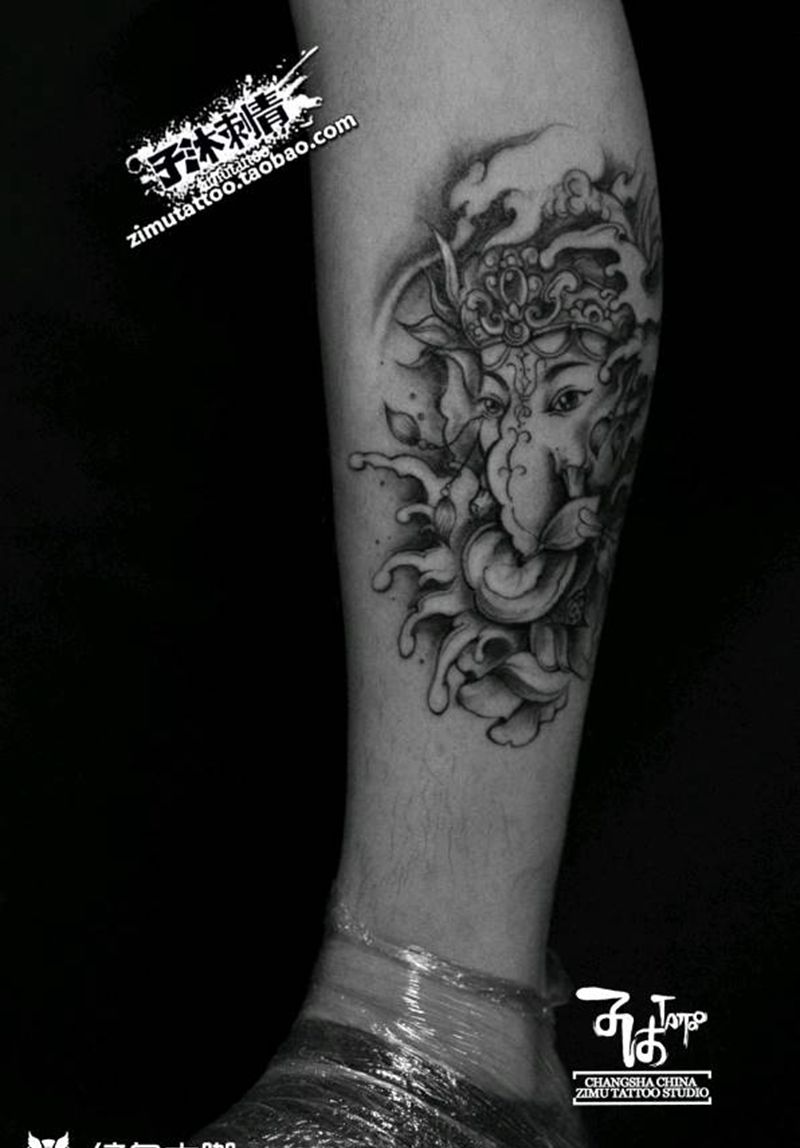 象神在小腿 简洁新传统纹身图片_肖像清新国画动物人物鬼神宗教原创泼墨成品纹身图案