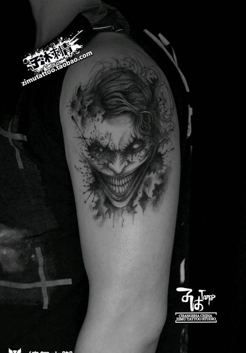 当前位置: 首页 >湖南省长沙市纹身店-子沐刺青艺术纹身工作室纹身图案>大臂 美漫DC暗黑泼墨抽象小丑纹身图片_手臂欧美写实水墨纹身图案