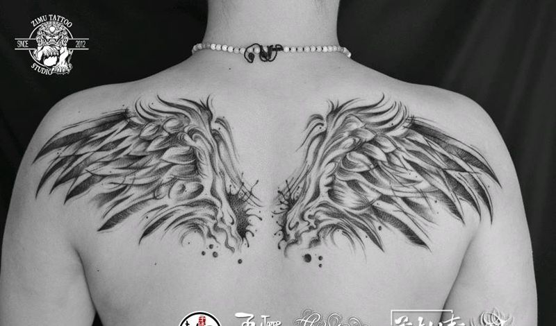 当前位置: 首页 >湖南省长沙市纹身店-子沐刺青艺术纹身工作室纹身图案>后背泼墨翅膀抽象纹身图片_水墨几何纹身图案
