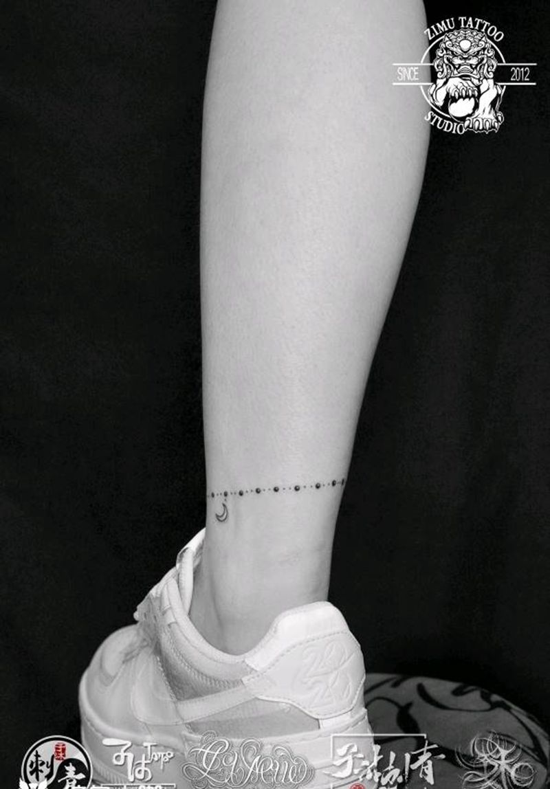 当前位置: 首页 >湖南省长沙市纹身店-子沐刺青艺术纹身工作室纹身图案>脚链脚环脚踝小清新月亮点缀纹身图片_脚部几何点刺纹身图案