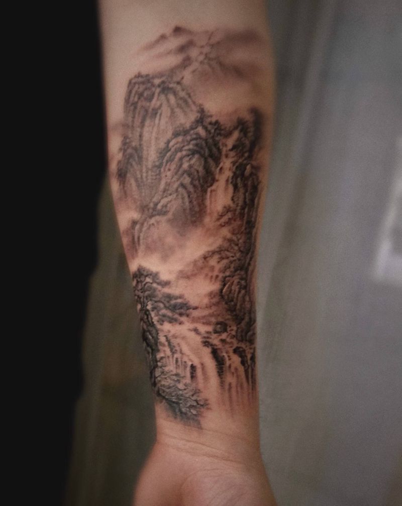 当前位置: 首页 >湖南省长沙市纹身店-长沙向阳花刺青纹身图案>山水待续纹身图片_手臂水墨山水纹身图案