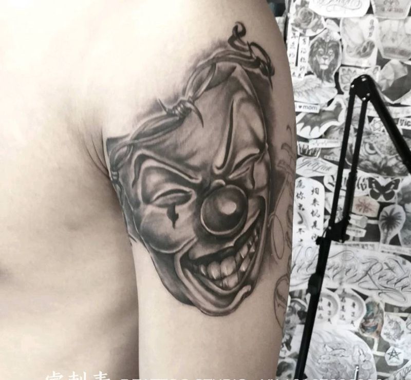 当前位置: 首页 >湖南省衡阳市纹身店-睿刺青艺术工作室纹身图案>小丑面具背景未完纹身图片