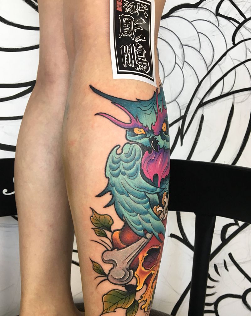• T网红王老大花腿龙纹身图片_腿部新传统纹身图案