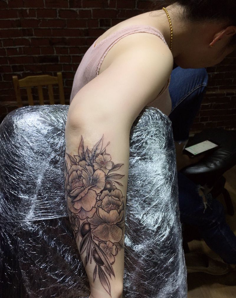 素花遮盖美女临时有事,未完纹身图片_手臂纹身图案