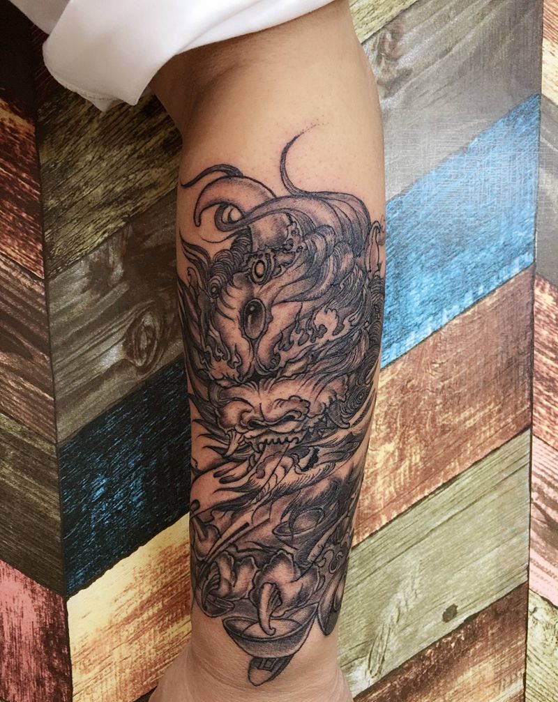 当前位置: 首页 >湖南省衡阳市纹身店-耒阳凡歌纹身纹绣纹身图案>唐狮纹身图片_手臂纹身图案