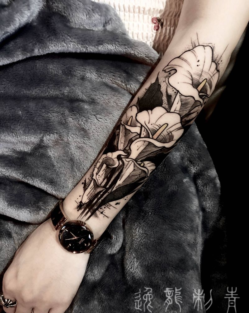 当前位置: 首页 >湖南省株洲市纹身店-逸龙刺青纹身图案>百合暗黑纹身图片_手臂点刺水墨百合暗黑纹身图案