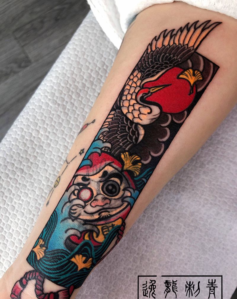 日式小图遮盖纹身图片_手臂老传统达摩仙鹤纹身图案