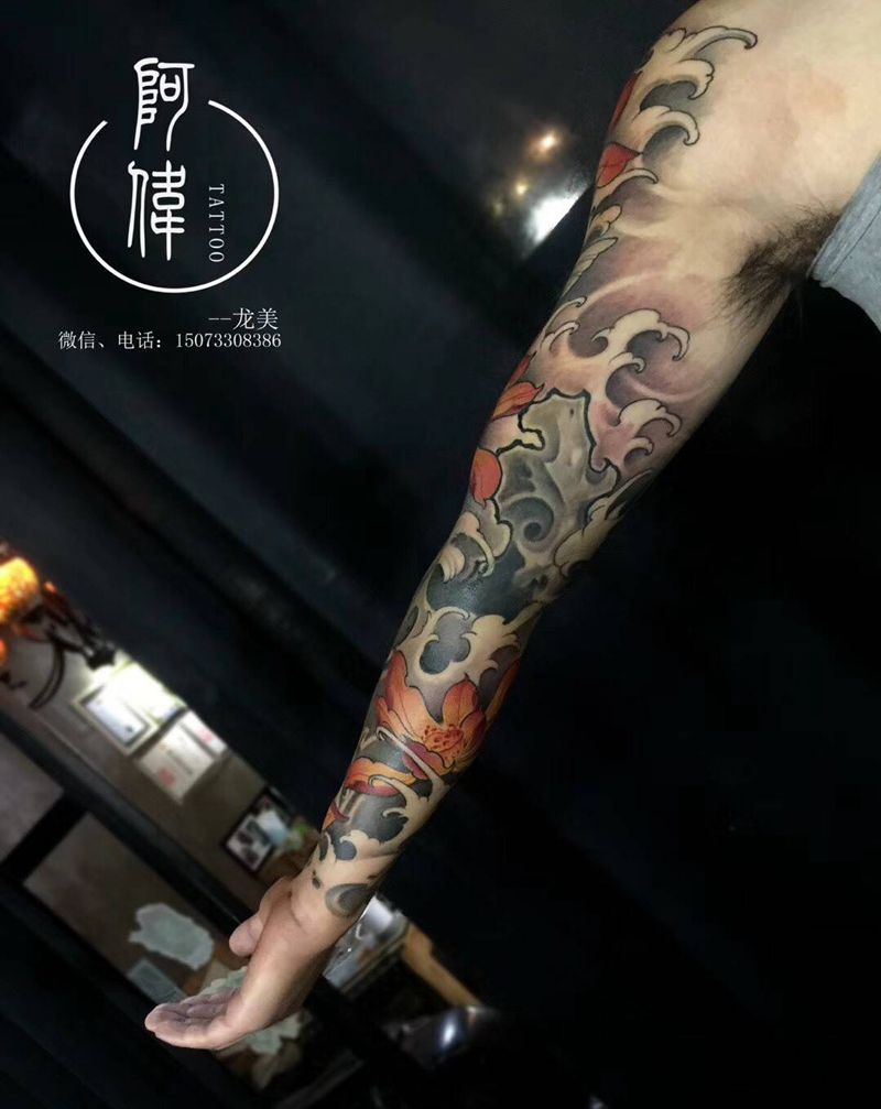 当前位置: 首页 >湖南省株洲市纹身店-逸龙刺青纹身图案>新传统花臂,湘潭的哥们纹身图片