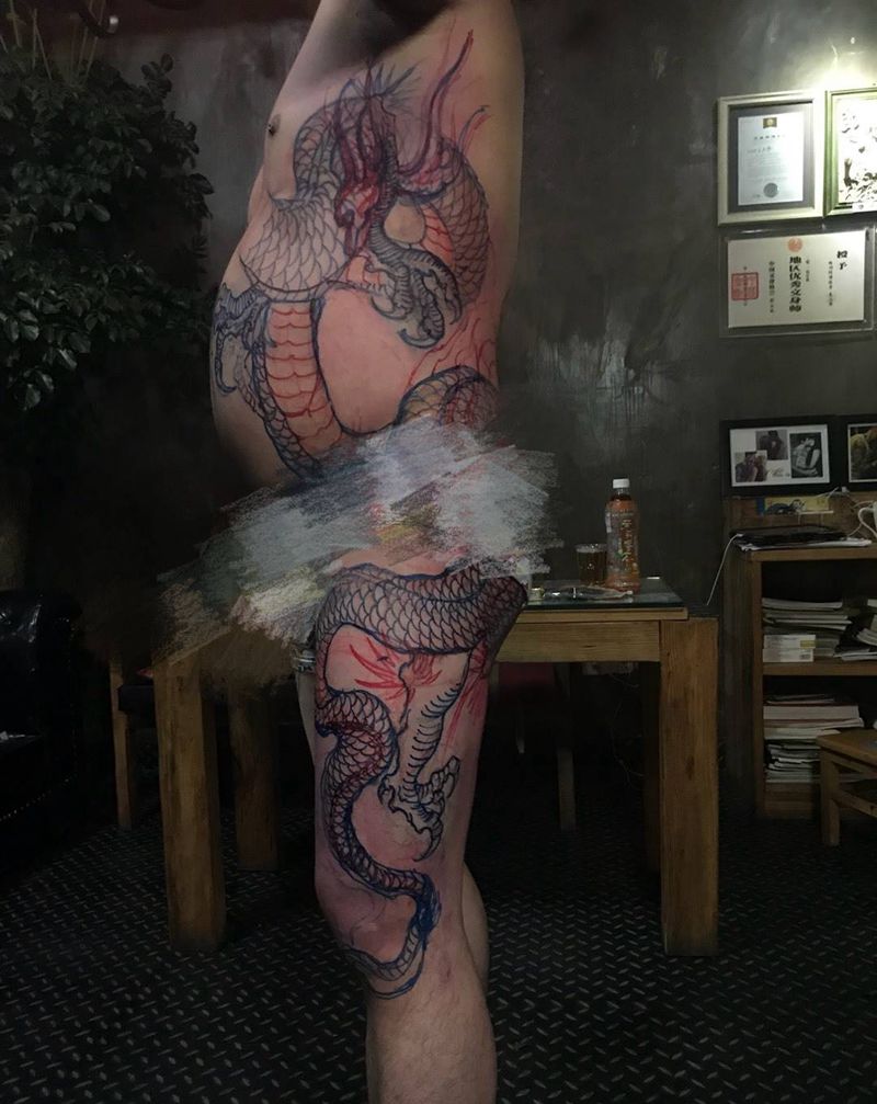 • T网红王老大花腿龙纹身图片_腿部新传统纹身图案