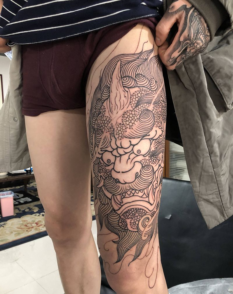 • T网红王老大花腿龙纹身图片_腿部新传统纹身图案