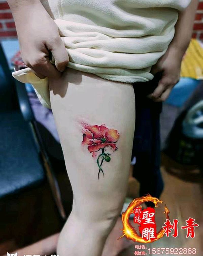 水墨· 罂粟花纹身图片_腿部水墨水彩纹身图案