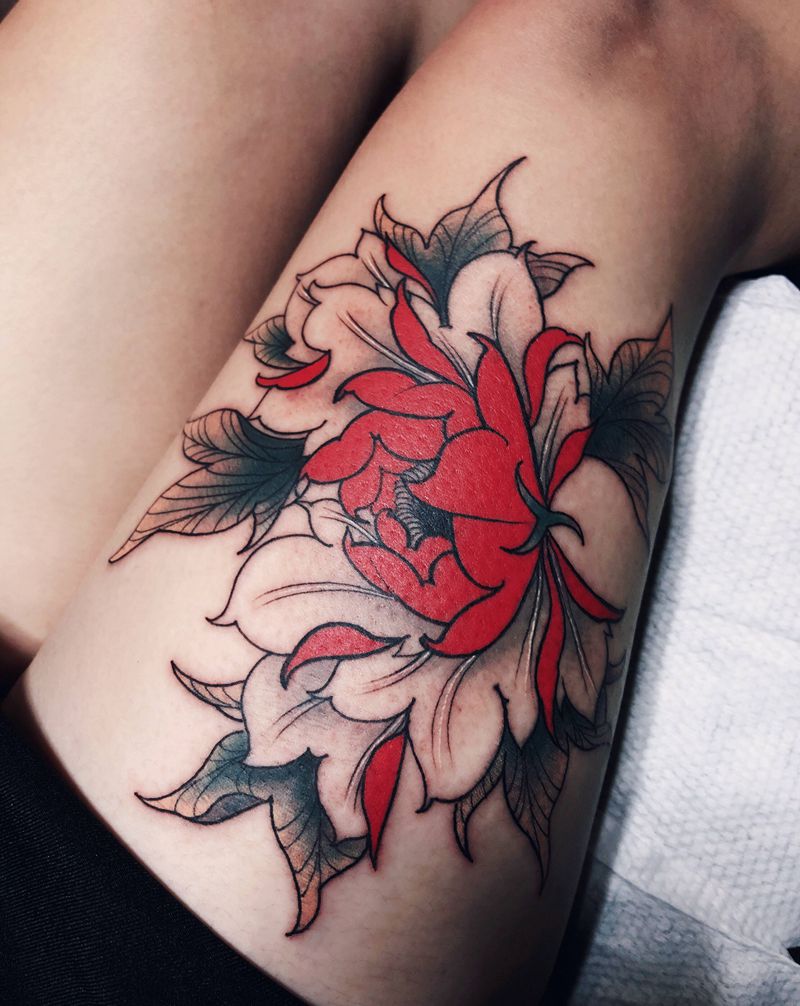 中国红牡丹纹身图片_腿部New School牡丹纹身图案