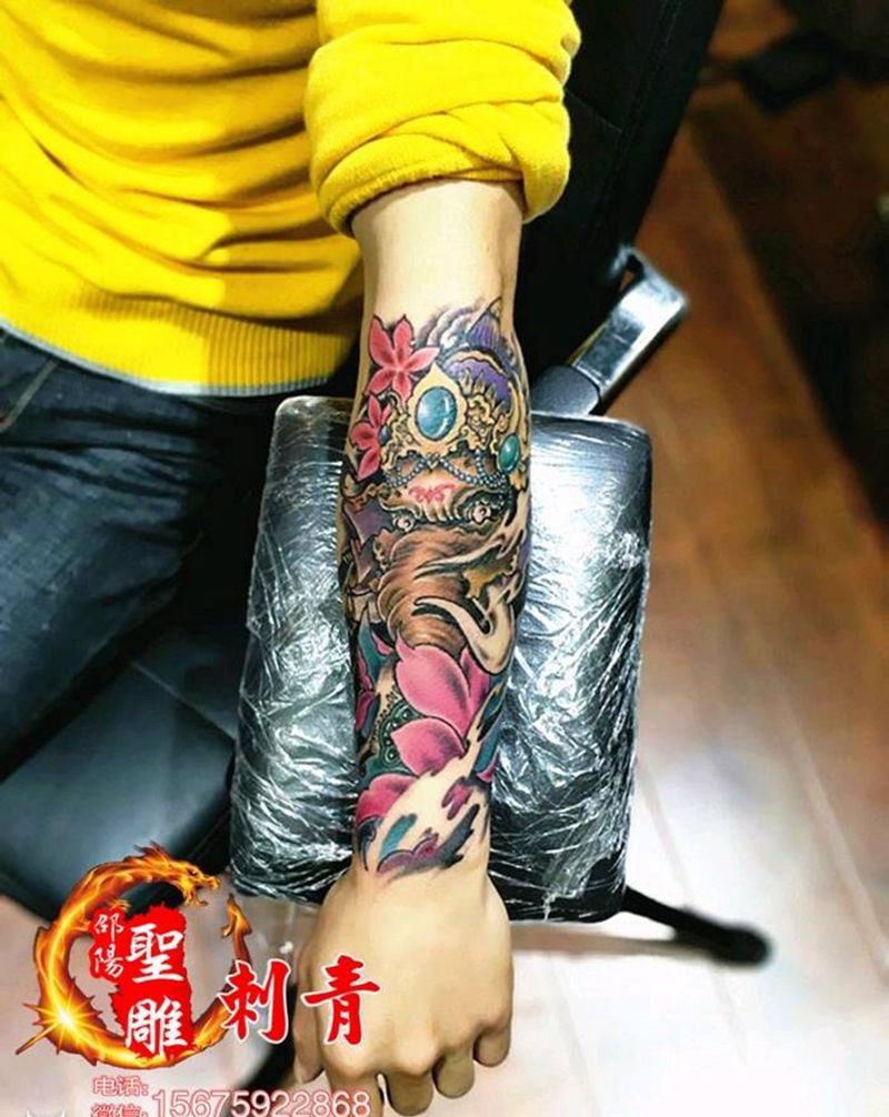 当前位置: 首页 >湖南省邵阳市纹身店-邵阳聖雕刺青纹身图案>象神花臂纹身图片_手臂传统成品纹身图案