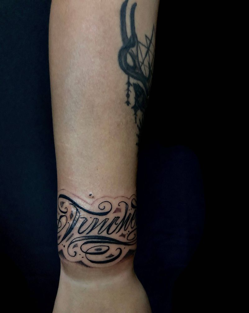 软花臂环纹身图片_手臂花体字纹身图案