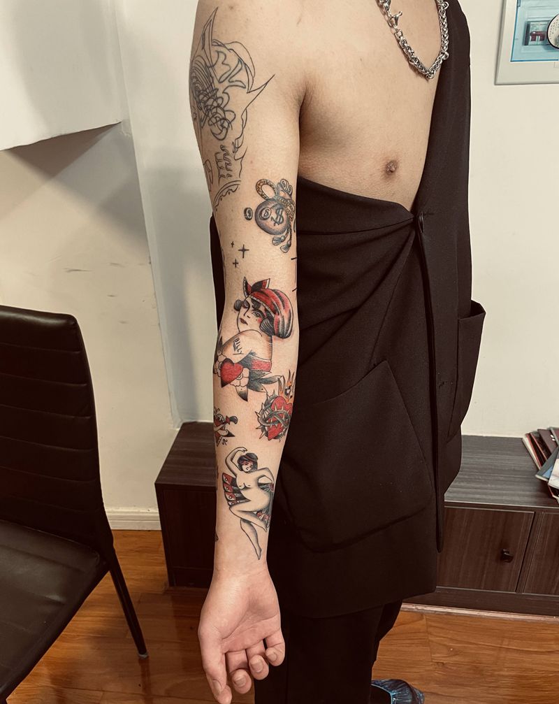 当前位置: 首页 >湖南省邵阳市纹身店-大凯刺青纹身馆纹身图案>花臂未完纹身图片_手臂手部新传统欧美写实纹身图案