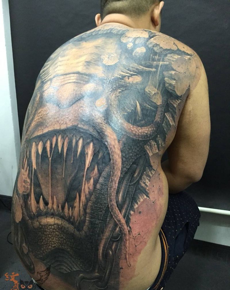 当前位置: 首页 >湖南省岳阳市纹身店-岳阳新刺客纹身图案>《龙威-挣脱》纹身图片_背部写实成品原创动物欧美纹身图案