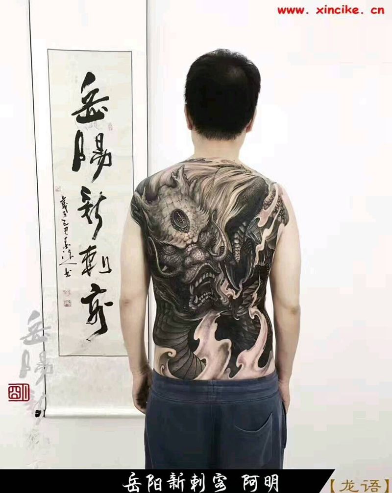 当前位置: 首页 >湖南省岳阳市纹身店-岳阳新刺客纹身图案>龙语纹身图片_背部传统写实原创龙满背成品纹身图案