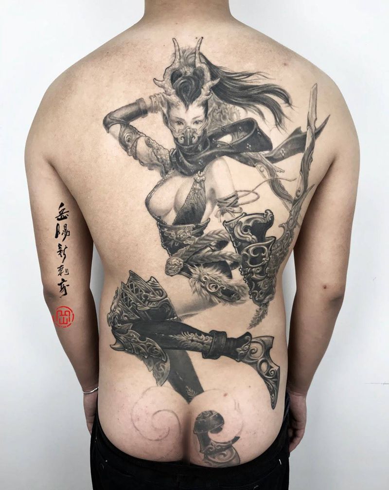 当前位置: 首页 >湖南省岳阳市纹身店-岳阳新刺客纹身图案>龙女纹身图片_成品背部写实传统人物原创龙鬼神纹身图案