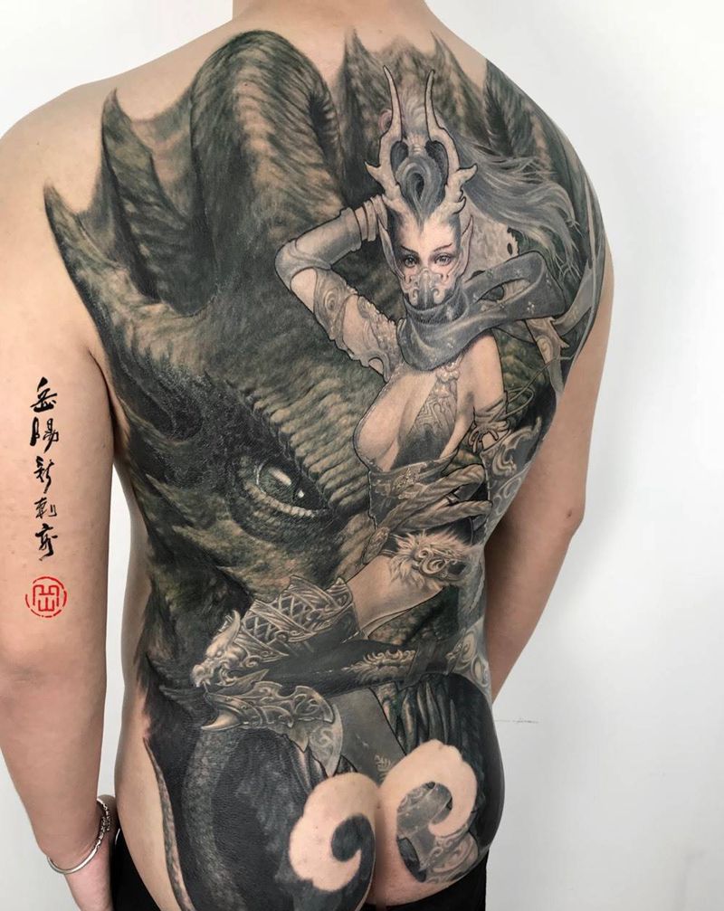 当前位置: 首页 >湖南省岳阳市纹身店-岳阳新刺客纹身图案>龙女纹身图片_成品背部写实传统人物原创龙鬼神纹身图案