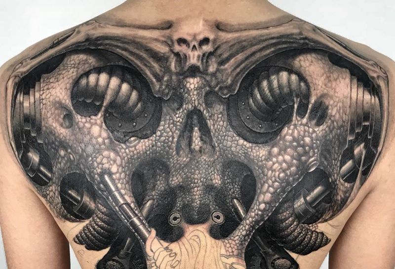 《生命之椎4-异变》纹身图片_成品背部写实欧美原创机械3D纹身图案