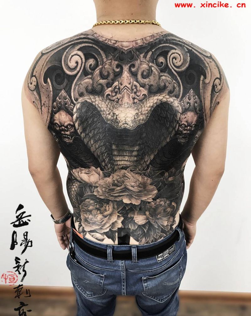 守护纹身图片_成品背部写实传统原创宗教动物鬼神纹身图案