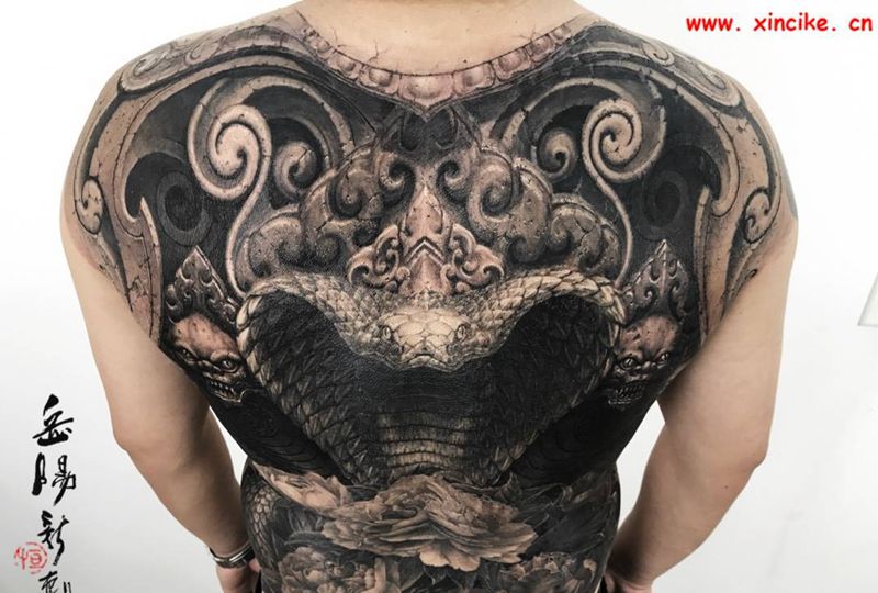 守护纹身图片_成品背部写实传统原创宗教动物鬼神纹身图案