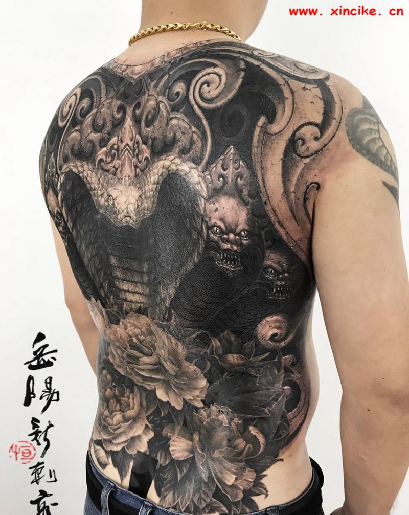 守护纹身图片_成品背部写实传统原创宗教动物鬼神纹身图案