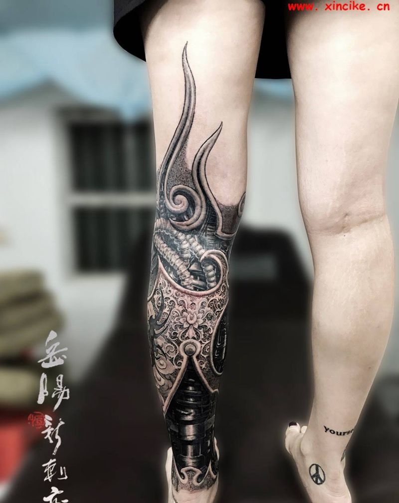 当前位置: 首页 >湖南省岳阳市纹身店-岳阳新刺客纹身图案>凤甲靴纹身图片_成品腿部写实欧美原创机械纹身图案