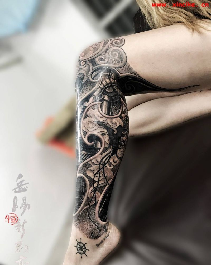 凤甲靴纹身图片_成品腿部写实欧美原创机械纹身图案