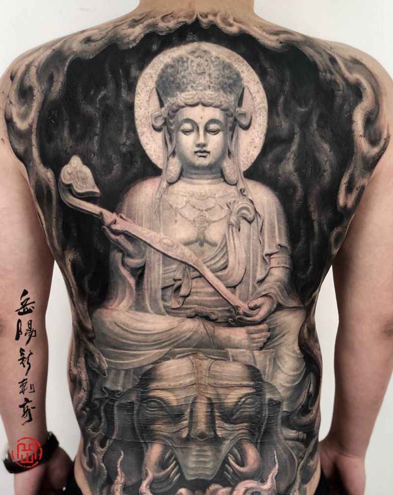当前位置: 首页 >湖南省岳阳市纹身店-岳阳新刺客纹身图案>.纹身图片_成品背部传统写实原创宗教鬼神菩萨佛纹身图案