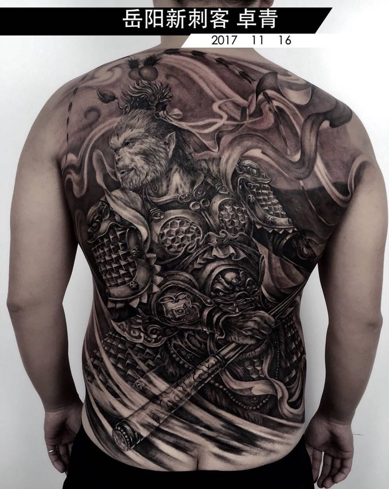 当前位置: 首页 >湖南省岳阳市纹身店-岳阳新刺客纹身图案>卓青作品纹身图片_成品背部手臂写实传统肖像原创猴子人物情侣纹身图案
