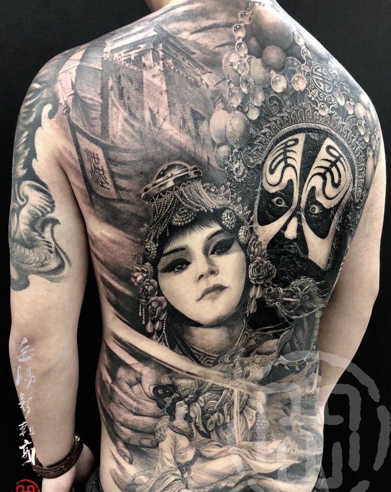 霸王别姬纹身图片_背部新传统欧美写实霸王别姬纹身图案