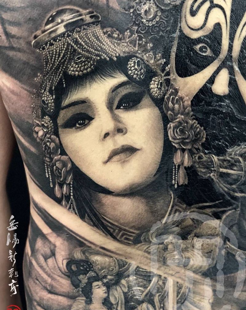 霸王别姬纹身图片_背部新传统欧美写实霸王别姬纹身图案