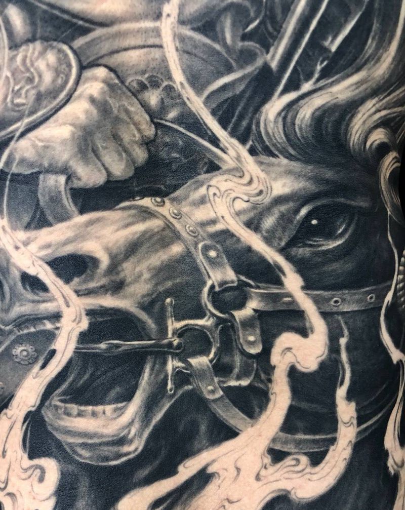 当前位置: 首页 >湖南省岳阳市纹身店-岳阳新刺客纹身图案>《持戟驭赤》纹身图片_背部新传统欧美写实武将纹身图案