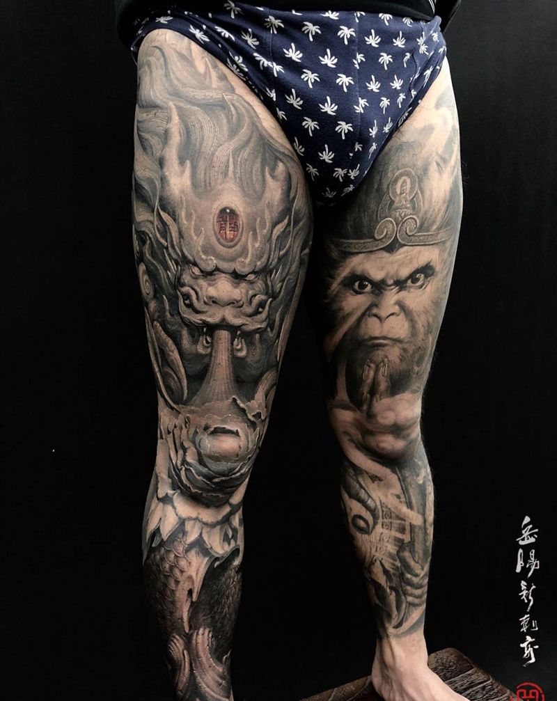 • T网红王老大花腿龙纹身图片_腿部新传统纹身图案