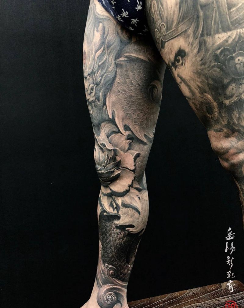 • T网红王老大花腿龙纹身图片_腿部新传统纹身图案